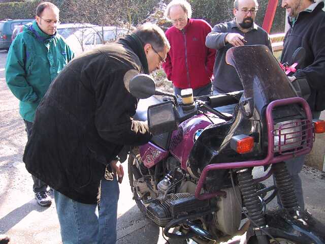 Experten-Team vom Freiburger-Schrauberkurs mit Versuchs Q beim Einstellen der Vergaser.